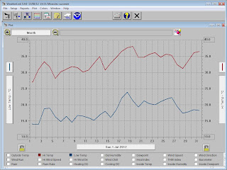Añadimos este mes,y lo haremos los siguientes meses,una gráfica en la que sólo aparecen la temperatura máxima y mínima de cada día del mes. Aquí se puede ver mucho mejor las diferencias entre la primera y segunda quincena del mes.