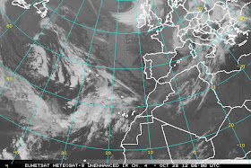 La situación sinóptica del siguiente mapa es de hoy día 3 de noviembre pero se puede extrapolar a los días anteriores.Vemos una imagen del canal de vapor de agua,donde se puede localizar bien las zonas donde la troposfera media y alta tiene más humedad.Podemos ver el centro de la baja al W de las islas Canarias y un centro de altas presiones que se situaba en el interior del continente africano.Entre ambos centros de acción se canaliza una corriente de vientos de SW que arrastra una masa de aire muy cálida,húmeda e inestable que viene casi desde el ecuador.Que el aire venga desde esa latitud tan meridional se debe a que la canalización se ha producido muy al sur,un fenómeno que aunque no es normal tampoco es raro durante los meses de finales de verano y el otoño.